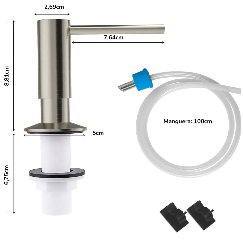 Presentamos el Dosificador de Jabón Líquido Bajo Encimera Cromado SAPONE CROME GRIFERS, una sofisticada y funcional solución para mantener la higiene en tu espacio con elegancia. Este dispensador de jabón está diseñado con la calidad y el estilo en mente, fabricado en acero inoxidable de máxima calidad que combina perfectamente con los acabados CROME DE GRIFERS. No solo cumple con su propósito principal de proporcionar una forma eficiente y cómoda de dispensar jabón líquido, sino que también añade un toque de lujo a tu entorno. - Diseño Cromado de Alta Gama: El Dosificador de Jabón Líquido Bajo Encimera SAPONE CROME GRIFERS es la elección perfecta para quienes buscan un diseño elegante y moderno en su baño o cocina. El acabado cromado brilla con lujo y se integra sin esfuerzo con cualquier decoración. - Durabilidad Incomparable: Fabricado en acero inoxidable de la más alta calidad, este dosificador está diseñado para resistir el paso del tiempo, evitando la corrosión y el desgaste, lo que garantiza una vida útil prolongada y un aspecto impecable. - Instalación Bajo Encimera: Su diseño bajo encimera ahorra espacio y mantiene tu área de trabajo organizada y despejada. La manguera de 100cm incluida facilita su instalación y te da la flexibilidad necesaria para adaptarlo a tus necesidades. - Operación Sin Esfuerzo: El mecanismo de dispensación es suave y preciso, lo que permite un uso sin esfuerzo y una dosificación controlada del jabón líquido. Esto es esencial para mantener la higiene diaria de manera cómoda y eficiente. - Higiene Avanzada: El Dosificador SAPONE CROME GRIFERS reduce la propagación de gérmenes al eliminar la necesidad de tocarlo directamente. Esto es especialmente importante en entornos compartidos donde se valora la limpieza y la seguridad.